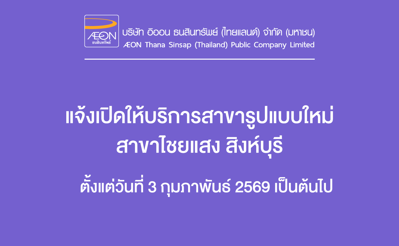 บริษัท อิออน ธนสินทรัพย์ (ไทยแลนด์) จำกัด (มหาชน) ขอเรียนให้ท่านทราบว่า บริษัทฯ จะเปิดให้บริการอิออนสาขาไชยแสง สิงห์บุรี ชั้น 1 ในรูปแบบใหม่ ตั้งแต่วันที่ 3 กุมภาพันธ์ 2569 เป็นต้นไป