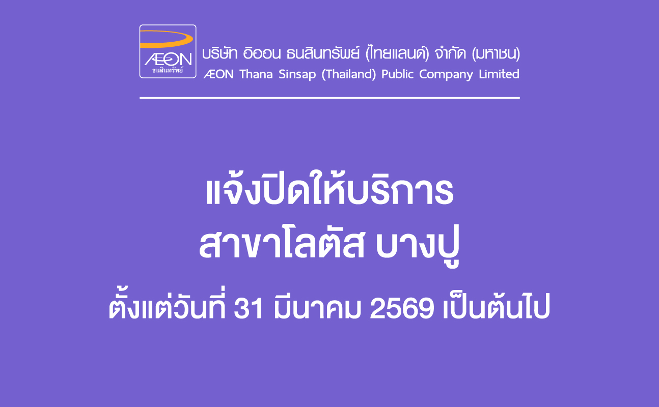 บริษัท อิออน ธนสินทรัพย์ (ไทยแลนด์) จำกัด (มหาชน) ขอเรียนให้ท่านทราบว่าบริษัทฯ จะดำเนินการปิดสาขาโลตัส บางปู ในวันที่ 31 มีนาคม 2569 เป็นต้นไป ท่านสามารถใช้บริการสาขาใกล้เคียงได้ที่สำนักงานสาขาโรบินสัน สมุทรปราการ บริเวณชั้น 3 หรือใช้บริการผ่านแอป AEON THAI MOBILE