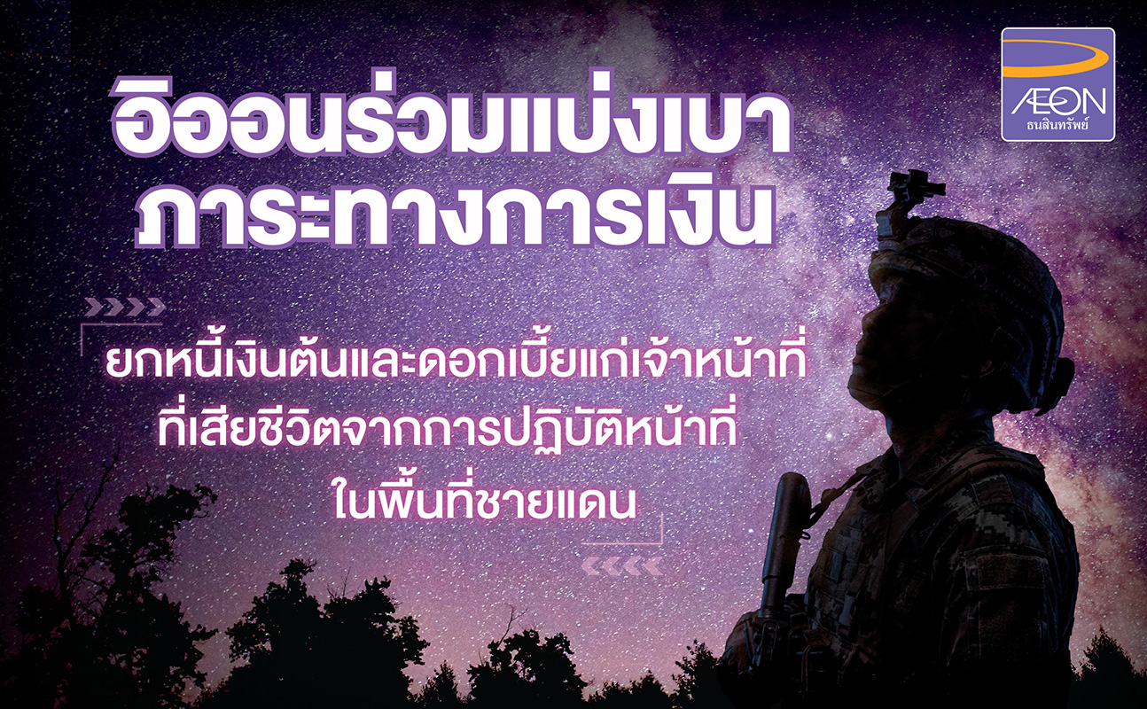 บริษัท อิออน ธนสินทรัพย์ (ไทยแลนด์) จำกัด (มหาชน) ขอแสดงความเสียใจอย่างสุดซึ้งต่อครอบครัวของเจ้าหน้าที่ผู้เสียสละจากการปฏิบัติหน้าที่ในพื้นที่ชายแดน (อุบลราชธานี สุรินทร์ บุรีรัมย์ ศรีษะเกษ สระแก้ว จันทบุรี และ ตราด) โดยบริษัทฯขอร่วมเป็นอีกหนึ่งแรงสนับสนุนในช่วงเวลาที่ยากลำบาก เพื่อร่วมแบ่งเบาภาระและบรรเทาผลกระทบด้านการเงิน บริษัทฯ ได้ออก มาตรการช่วยเหลือด้านภาระหนี้ สำหรับลูกค้า AEON ที่เข้าเงื่อนไข โดยครอบคลุมแนวทางการช่วยเหลือ ดังนี้