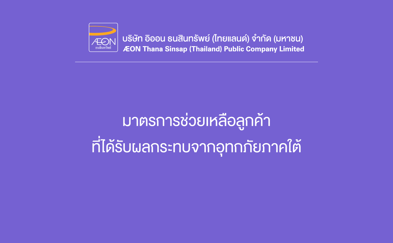 บริษัท อิออน ธนสินทรัพย์ (ไทยแลนด์) จำกัด (มหาชน) ("บริษัทฯ") มีความห่วงใยลูกค้าที่อาศัยหรือประกอบอาชีพในพื้นที่ประสบอุทกภัยภาคใต้ ซึ่งส่งผลให้ลูกค้ามีภาระทางการเงินเพิ่มขึ้นในการฟื้นฟูความเสียหาย หรือมีความสามารถในการชำระหนี้ลดลง