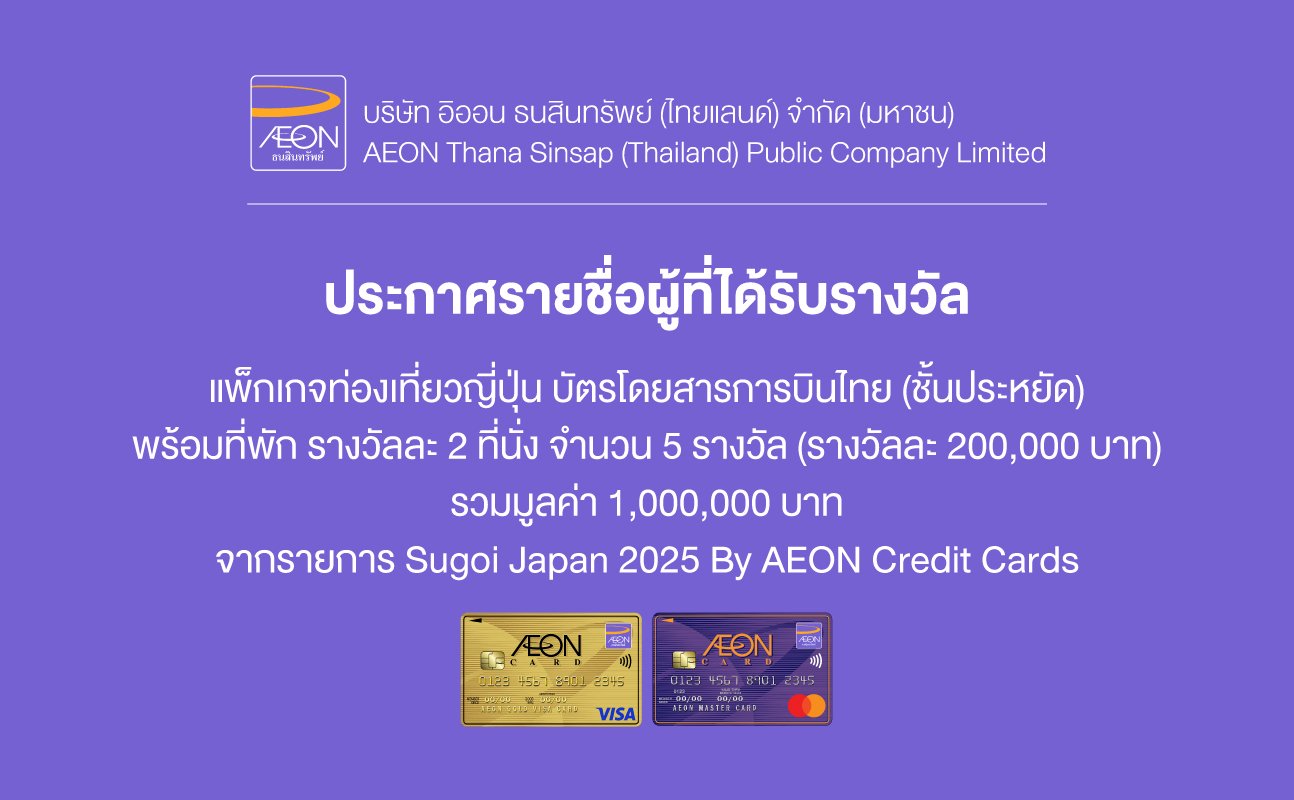 บริษัท อิออน ธนสินทรัพย์ (ไทยแลนด์) จำกัด มหาชน ขอแจ้งรายชื่อลูกค้าที่ได้รับรางวัลจากรายการส่งเสริมการขาย “Sugoi Japan 2025 by AEON Credit Cards” สำหรับผู้ที่เข้าร่วมรายการส่งเสริมการขายกับอิออน ภายใต้เงื่อนไขของบริษัทฯ ระหว่างวันที่ 1 กรกฏาคม – 31 สิงหาคม 2568 รับแพ็คเกจท่องเที่ยวญี่ปุ่น บัตรโดยสารการบินไทย (ชั้นประหยัด) พร้อมที่พัก 5 วัน 3 คืน สำหรับ 2 ท่าน จำนวนรวม 5 รางวัล รวมมูลค่า 1,000,000 บาท โดยรายชื่อทั้ง 5 ท่าน มีดังนี้